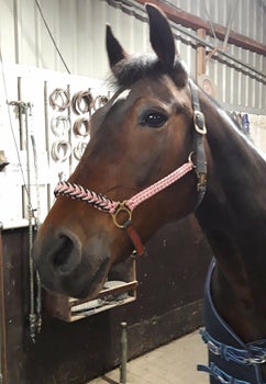 VOOR DEZE LIEVE BANJER...Heb ik een halster, gedeeltelijk "gerenoveerd" Was best lastig omdat ik het halster niet goed kon spannen op mijn plank. Wilde nog op de neusband, goudkleurige kraaltjes doen, maar stom..ik had deze al afgehecht, dus kon niet meer. Beginnersfoutje...haha..volgende keer komen ze er wel op.